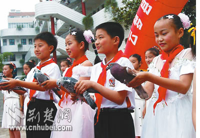 云夢縣組織豐富多彩的慶“六一”兒童節(jié)活動。圖為在該縣舉辦的“歌唱祖國,歌頌和平,放飛心愿”為主題的校園文藝演唱會上,青少年學(xué)生放飛和平鴿的情景。
