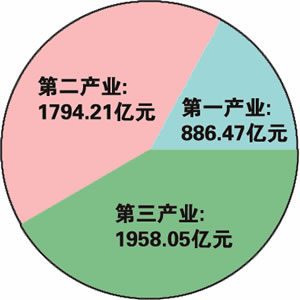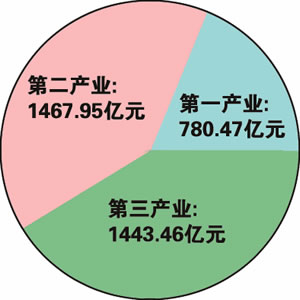 全省國民生產(chǎn)總值達4633.73億元,比上年增長9.6%,為1998年以來增速最快的一年。其中,第一產(chǎn)業(yè)完成增加值885.87億元,增長3.6%;第二產(chǎn)業(yè)增加值1793.71億元,增長12.6%;第三產(chǎn)業(yè)增加值1954.15億元,增長9.6%。按常住人口計算,人均GDP為7247元。三個產(chǎn)業(yè)結構比為19.1∶38.7∶42.2。