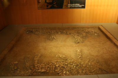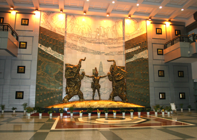 展廳門(mén)口聳立著的巨幅雕塑,表現(xiàn)古代一人牽?jī)上蟮那榫,這也是河南的簡(jiǎn)稱(chēng)“豫”的由來(lái)。