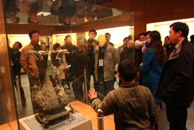 12月5日下午,聚焦中部話(huà)崛起采訪(fǎng)團(tuán)一行20多人,興致勃勃地參觀了位于鄭州市北的河南博物院。該院匯集石器、陶器、瓷器、青銅器、金銀器等精美文物2000余件,詳盡的展現(xiàn)了由以彩陶為代表的仰韶文化、春秋戰(zhàn)國(guó)青銅器文明以至明清陶瓷藝術(shù)的河南古代文化發(fā)展脈絡(luò)。徜徉在這座文物的大觀園里,記者們對(duì)中華民族悠久燦爛的古代文明發(fā)出由衷的贊嘆。(荊楚網(wǎng)記者 王淳攝)