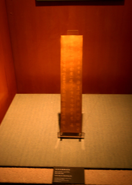 河南博物院的“鎮(zhèn)館之寶”之二的唐武則天除罪金簡(jiǎn)。它是武則天在久視元年(公元700年)7月7日到嵩山祈福,譴宮廷太監(jiān)胡超向諸神投簡(jiǎn)以求除罪消災(zāi)。這是中國(guó)目前發(fā)現(xiàn)的唯一金簡(jiǎn)。