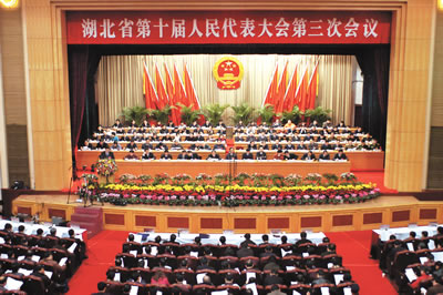 上午9時,主席團(tuán)常務(wù)主席楊永良主持開幕大會。本次會議應(yīng)到代表727人,實(shí)到代表682人,符合法定人數(shù)。他宣布:湖北省第十屆人民代表大會第三次會議開幕。