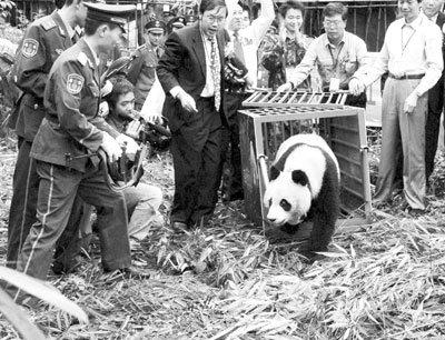 荊楚網(wǎng)消息(楚天都市報(bào))一只野生大熊貓日前闖入四川省都江堰鬧市(本報(bào)曾予報(bào)道),被當(dāng)?shù)亓謽I(yè)部門營(yíng)救,并被送往臥龍自然保護(hù)區(qū)療養(yǎng)。8月8日,戴有GPS衛(wèi)星定位儀器的大熊貓被放歸都江堰龍溪虹口國(guó)家自然保護(hù)區(qū)。當(dāng)天,它沒說(shuō)拜拜就踏出鐵籠走入密林,前后不到10秒鐘。科研人員在今后一年多的時(shí)間內(nèi),將對(duì)它進(jìn)行定位跟蹤,這有助于科學(xué)家進(jìn)一步了解和掌握大熊貓野外生活習(xí)性和活動(dòng)規(guī)律。(新華社發(fā))