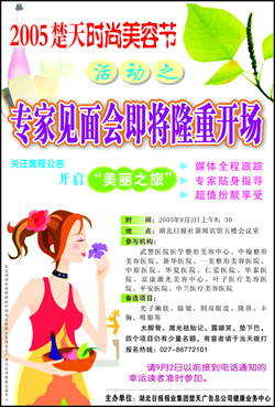 荊楚網(wǎng)消息(楚天金報)2005楚天時尚美容節(jié)今起正式啟動,本集團(tuán)將聯(lián)合武漢各大時尚美容機(jī)構(gòu),為愛美時尚人士提供各項時尚美容“大餐”。
