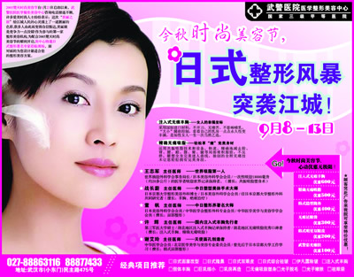 今日起,對光子嫩膚、割雙眼皮、隆鼻、除皺、豐胸、脫毛、文唇、美齒等時尚美容感興趣的讀者,可撥打電話027-86772101,報名參加“美麗之旅”,本集團(tuán)將組織專家篩選之后,為入圍讀者量身定做各種免費(fèi)美容體驗項目;同時,想詳細(xì)了解各種美容過程的讀者,也可報名參加,現(xiàn)場觀摩。報名活動將持續(xù)到本周五。