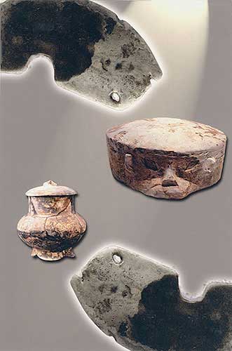魚鳥形玉璜:裝飾品(上、下,長(zhǎng)6.6厘米)[相關(guān)鏈接]:20世紀(jì)中國(guó)百項(xiàng)考古大發(fā)現(xiàn)(1-20)21、大溪遺址(圖)22、城頭山遺址(圖)23、屈家?guī)X遺址(圖)24、崧澤遺址(圖)25、馬家窯遺址(圖)26、柳灣墓地(圖)27、牛河梁遺址(圖)28、城子崖遺址(圖)29、良渚文化遺址群(圖)30、石家河遺址群(圖)31、陶寺遺址(圖) 32、王城崗遺址(圖)33、齊家坪遺址(圖)34、卡若遺址(圖)35、石峽遺址(圖) 36、東灣仔北遺址(圖)37、圓山遺址(圖)38、二里頭遺址(圖)39、東下馮遺址(圖)40、夏家店遺址(圖)