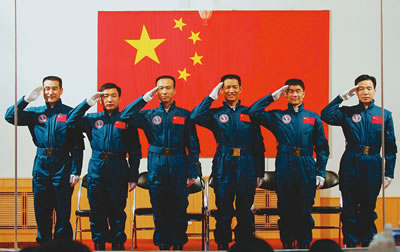 昨日,6位中國(guó)航天員在酒泉衛(wèi)星發(fā)射中心航天員公寓———問(wèn)天閣的一個(gè)大廳內(nèi)集體亮相。由左至右是:翟志剛、吳杰、費(fèi)俊龍、聶海勝、劉伯明、景海鵬。新華社記者趙建偉攝