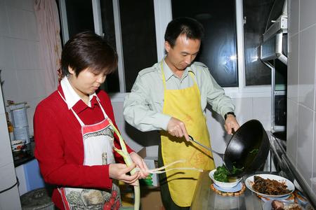 航天員費(fèi)俊龍在家中幫愛人王潔炒菜,樂在其中