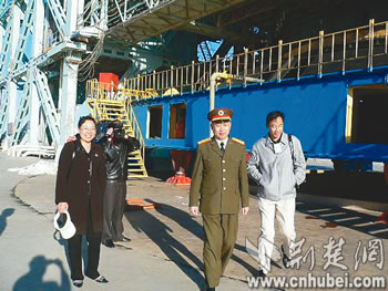 發(fā)射完畢后,酒泉衛(wèi)星發(fā)射中心參謀長吳年生帶領(lǐng)湖北老鄉(xiāng)參觀發(fā)射架。本報(bào)通訊員李福元攝