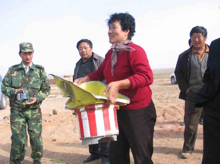 記者在搜索現(xiàn)場看到,從四面八方趕來的牧民群眾個個都有所獲!肮,人們常說天上掉餡餅,這不應(yīng)驗了?”牧民張金虎指著自己撿到的一堆殘骸,興奮地開著玩笑。牧民烏云還向記者炫耀,她和丈夫烏力吉今天特意起了個大早,在家焚香默默祝愿神舟六號飛船試驗成功,所以今天他們撿到的殘骸最多,能裝滿滿一車。