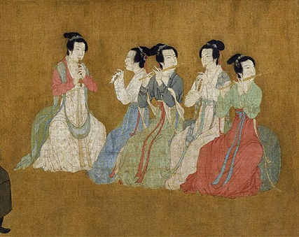 作品的藝術(shù)水平也相當(dāng)高超。造型準(zhǔn)確精微,線條工細(xì)流暢,色彩絢麗清雅。不同物象的筆墨運(yùn)用又富有變化,尤其敷色更見豐富、和諧,仕女的素妝艷服與男賓的青黑色衣衫形成鮮明對(duì)照。幾案坐榻等深黑色家具沉厚古雅,仕女裙衫、簾幕、帳幔、枕席上的圖案又絢爛多采。不同色彩對(duì)比參差,交相輝映,使整體色調(diào)艷而不俗,絢中出素,呈現(xiàn)出高雅、素馨的格調(diào)。
