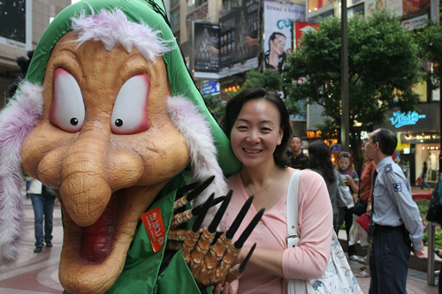 我們記者團抵港的次日,即為西方著名的萬圣節(jié)。時代廣場、銅鑼灣、蘭桂坊等西方人聚集地,鬼影憧憧,各種奇形怪狀的鬼魅競相走上街頭,游人爭相與之合影,小店酒吧亦裝飾相襯托的背影燈光,增添神秘色彩,組成一道道內(nèi)地少見的獨特風(fēng)景。