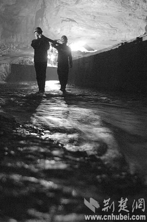 寂寞的蝙蝠第一次接待了人間來客,沉睡萬年的巖溶洞穴第一次迎來了觀者。但黑暗陌生的世界還是讓堂堂男兒們感覺了一絲陰森恐怖。他們曾聽當(dāng)?shù)匕傩諅髡f,洞里有巨蟒,所以至今沒人敢進(jìn)洞!白ゾo時間測量!”來不及恐懼,他們?yōu)樽约汗膭牛驗檫@里隨時可能發(fā)生漲水、墜落等危險。可惜,第一次經(jīng)驗不足,手電筒的電池很快用完了,一行人只得互相攙扶著,摸索出溶洞!昂髞,我們又進(jìn)去了7次,終于測出了暗河的具體位置和流向!狈轿奈湔f。