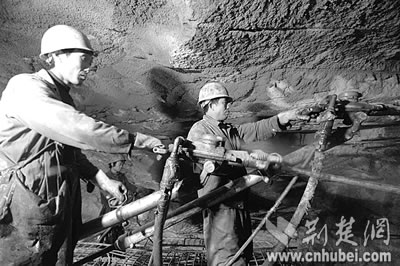 穿著雨衣的工人們手持風(fēng)槍,正在腳手架上下打爆破眼,山體里的水嘩啦啦直往下噴,然后順著挖好的水槽排向洞外,最多時(shí)一天要排3000立方米!斑@水算小的!”也許是察覺出我們眼神里的擔(dān)心,包秀峰輕松笑笑,仿佛一切都在他們掌控中。他甚至調(diào)侃說(shuō),“瞧,我們都穿皮鞋上班,施工環(huán)境沒你們想象中那么艱難!