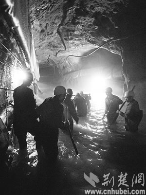 這是一群怎樣的鋼鐵漢子喲!他們兩年中遭遇38次突泥突水,每次大的搶險(xiǎn),都要持續(xù)數(shù)十小時(shí),每次都有10多人暈倒;從開工至今,先后有20多名工人實(shí)在頂不住,走掉了,但絕大多數(shù)人沒有向困難低頭,選擇了繼續(xù)戰(zhàn)斗;在掘進(jìn)工作面上,除了機(jī)械設(shè)備,他們身邊還有50多套救生衣、救生圈,1萬多條防水編織袋,甚至還有一只皮劃艇……