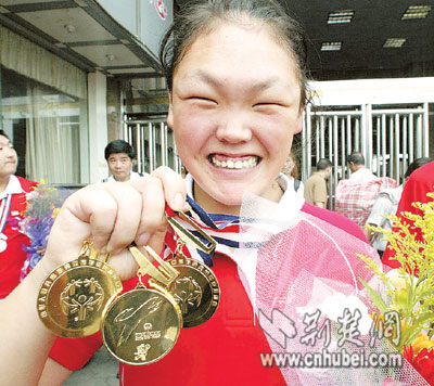 “這三枚金牌,一枚要送給爸爸,一枚送給媽媽,還有一枚要留給自己,我把鮮花送給教練!”昨日中午,剛剛走出漢口火車站的胡鳳琴,向前來迎接的市民及新聞媒體道出了自己的心聲。