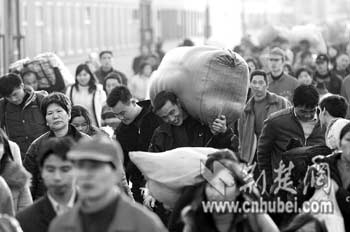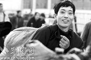 連日來,武昌火車站,滾滾旅客流中,背著大包小包的返鄉(xiāng)農(nóng)民工明顯增多了(上圖)。一年辛勞,收獲頗豐,農(nóng)民工露出了開心的笑容(下圖)。記者采訪得知,他們提前返鄉(xiāng),一方面是想避開春運高峰,同時也想多一些和家人團聚的時間。(記者張磊田悅攝)