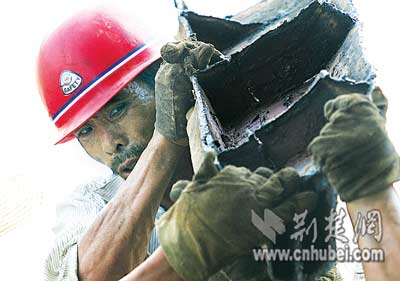 現(xiàn)場(chǎng)施工的8名農(nóng)民工都來(lái)自監(jiān)利縣。他們有的用焊槍切割船體,有的將割好的鋼板搬到岸上。每塊鋼板重約80公斤,兩個(gè)人抬著走,豆大的汗珠布滿(mǎn)黝黑的臉龐,隨著移動(dòng)的腳步一滴滴滾落地上。