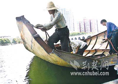 “船太大了,沒(méi)辦法運(yùn)出城,只好進(jìn)行分解后運(yùn)走!必(fù)責(zé)現(xiàn)場(chǎng)施工的馬先生解釋?zhuān)?002年初,他所在的公司承攬東湖清淤工程,共運(yùn)來(lái)8條清淤船,其中一條船放置在水果湖。當(dāng)時(shí),經(jīng)有關(guān)部門(mén)批準(zhǔn),這些船由大型車(chē)輛運(yùn)來(lái)并吊入湖中。目前清淤工程結(jié)束,湖中的船不好運(yùn)走,只好割成一塊塊鋼板,當(dāng)成廢鋼賣(mài)掉。