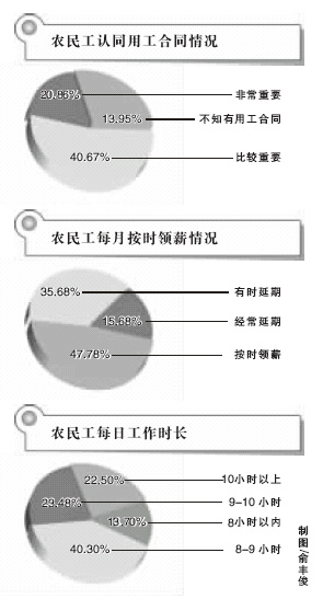 調查顯示農民工月薪多在500到800元之間,22.5%的農民工每日工作超10小時