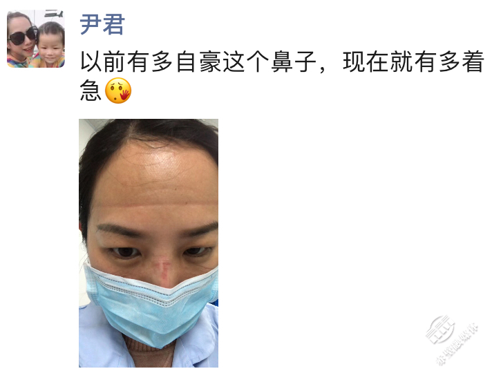 “以前有多自豪這個(gè)鼻子,現(xiàn)在就有多著急?!边B續(xù)高強(qiáng)度工作,長(zhǎng)時(shí)間佩戴口罩,將護(hù)士尹君的鼻梁勒磨得傷痕累累。短暫的心疼與“著急”后,她又繼續(xù)奔忙在市人民醫(yī)院隔離病區(qū)。