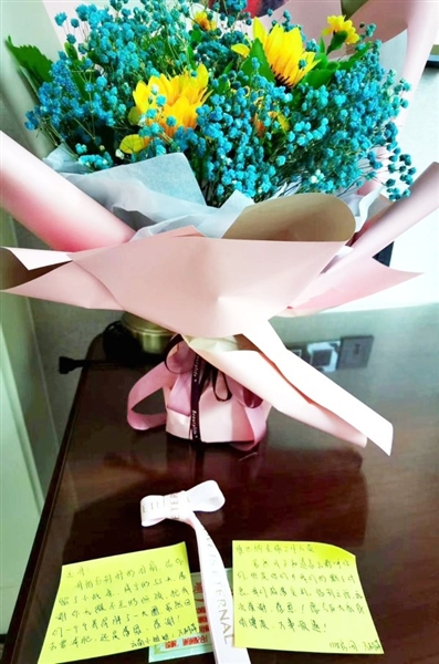 自稱為“云南小姐姐”的萬麗萍,將一束開得正艷的花和兩張小紙條擺在桌上?!坝窀?,我怕分別時的淚崩,給你留了小紙條。咸寧的55天,感謝你無微不至的照顧,把我們一個個養(yǎng)得胖了一大圈。雖然回去要減肥,還是感恩、感謝!”