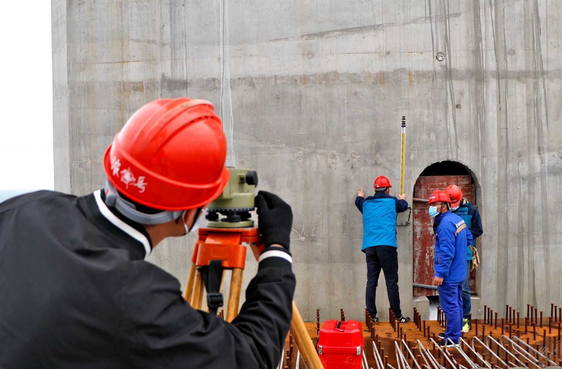 4月21日,赤壁長江公路大橋項目建設(shè)現(xiàn)場,技術(shù)人員為確保鋼梁準(zhǔn)確吊裝,正在進行定位測量。
