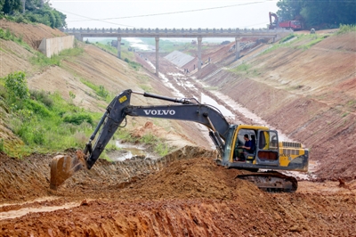 5月22日,在斧頭湖流域兩湖連通工程施工現(xiàn)場,工程翻斗車、推土機、壓路機往來穿梭,對下穿G351國道箱涵周邊進行土石分層填筑、分層碾壓。