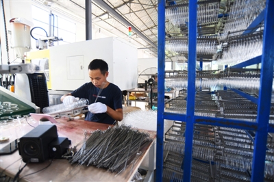 14日,通山縣經(jīng)濟開發(fā)區(qū)低碳產(chǎn)業(yè)園創(chuàng)盛光學(xué)有限公司,工人在眼鏡鏡片生產(chǎn)線上作業(yè)。