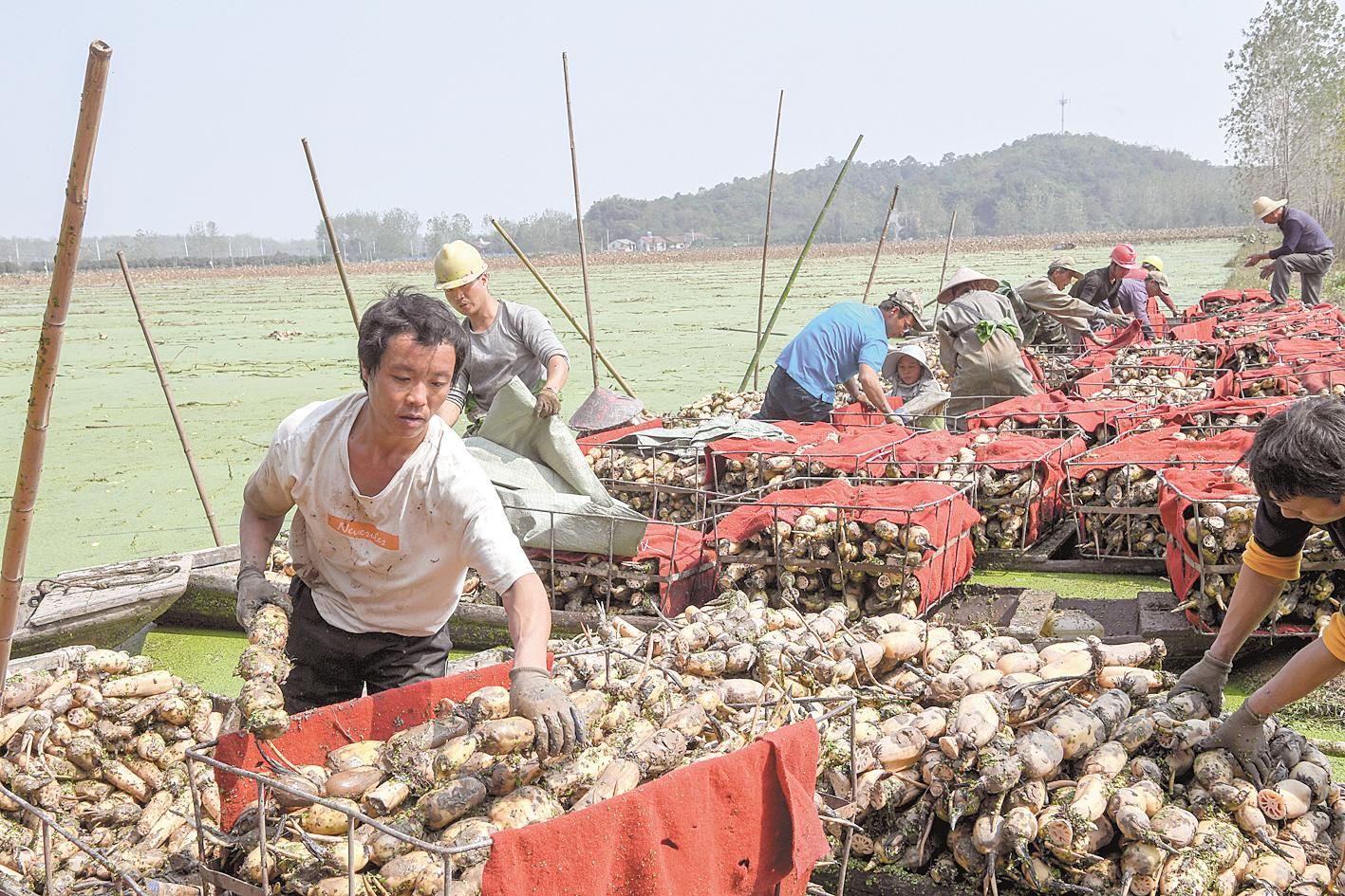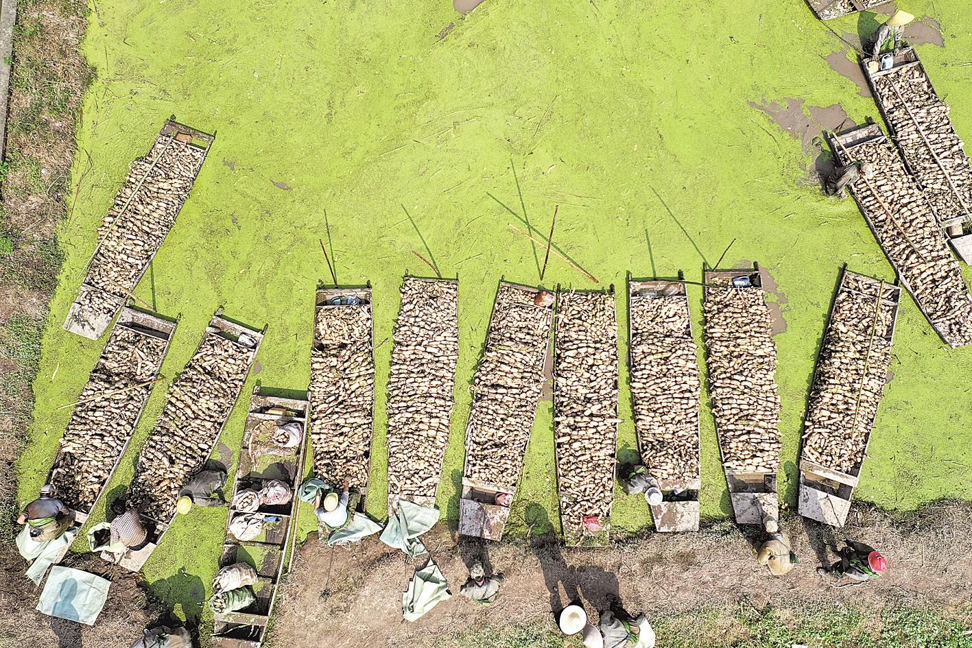 10月13日,嘉魚縣陸溪鎮(zhèn)農(nóng)民趁著晴好天氣挖藕。這些蓮藕經(jīng)嘉魚鴻富農(nóng)產(chǎn)品有限公司加工后,將出口至東南亞和北美等地區(qū)。嘉魚縣蓮藕、蓮子、藕帶是區(qū)域特色明顯的優(yōu)勢農(nóng)產(chǎn)品。近年來,嘉魚縣把發(fā)展蓮藕作為調(diào)整農(nóng)業(yè)產(chǎn)業(yè)結構、增加農(nóng)民收入的重要途徑。目前,全縣蓮藕種植面積4.85萬畝,2019年全縣蓮藕產(chǎn)業(yè)實現(xiàn)綜合產(chǎn)值5.6億元。