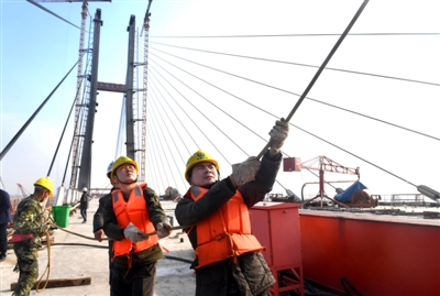 “再起來一點,往左偏5公分,好,停……”在胡榮鵬的指揮下,一塊離水面40多米高的鋼梁被順利吊起。