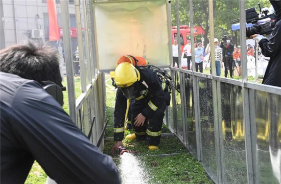 應(yīng)急技能大比武結(jié)束后,現(xiàn)場還進行了綜合應(yīng)急演練。情景設(shè)置某庫房發(fā)生火災(zāi),有人員被困,相關(guān)部門和單位接警后迅速到達現(xiàn)場,破拆廠房大門后打通救援通道進入火場,將大火撲滅。