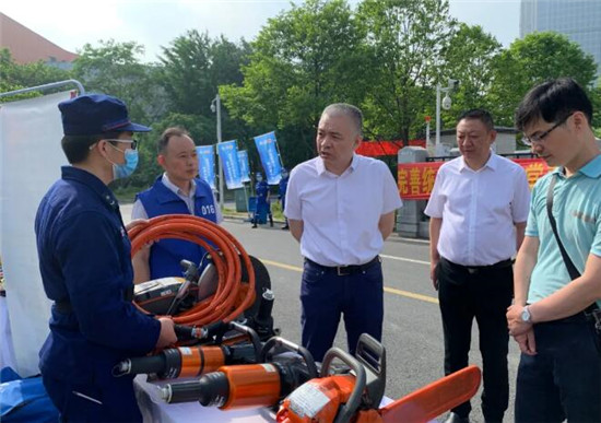 空中,兩架分別懸掛五星紅旗和中國消防救援旗的無人機盤旋飛行。廣場一角,江岸區(qū)應(yīng)急管理局組織的應(yīng)急救援裝備展臺上,正壓式空氣呼吸器、生命探測儀、無人機自動偵測防御打擊槍、各類應(yīng)急救援無人機等先進智能設(shè)備一字排開,為高效開展多災(zāi)種、大應(yīng)急、大救援提供了強有力的應(yīng)急保障。