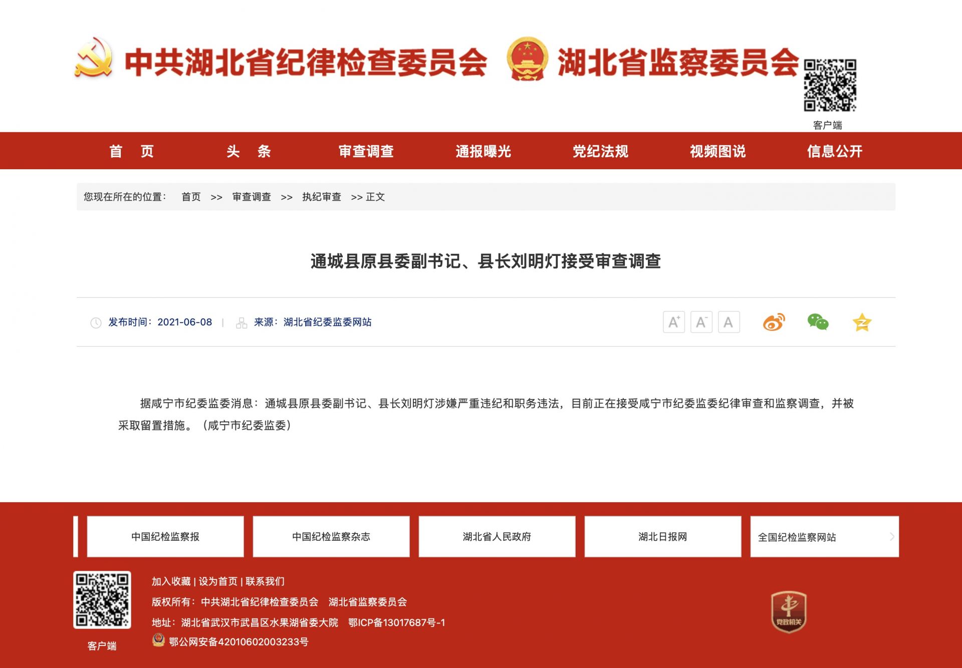 據(jù)咸寧市紀(jì)委監(jiān)委消息:通城縣原縣委副書記、縣長(zhǎng)劉明燈涉嫌嚴(yán)重違紀(jì)和職務(wù)違法,目前正在接受咸寧市紀(jì)委監(jiān)委紀(jì)律審查和監(jiān)察調(diào)查,并被采取留置措施。