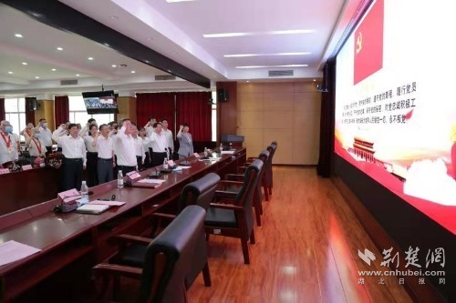 表彰結(jié)束后,會(huì)議室內(nèi)響起鏗鏘誓言。新黨員代表集體宣誓、老黨員重溫入黨誓詞。