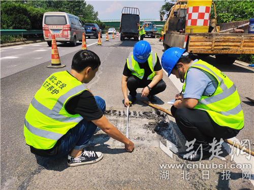 養(yǎng)護(hù)人在驕陽下測量路面坑槽。 通訊員 供圖
