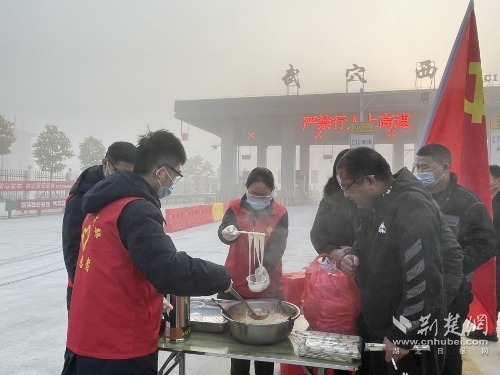 在武穴西收費(fèi)站,收費(fèi)員配合協(xié)助地方做好疫情防控工作的同時(shí),為往來(lái)司乘送上一碗碗熱騰騰的面條。( 通訊員黃利文、吳輝、張溪)