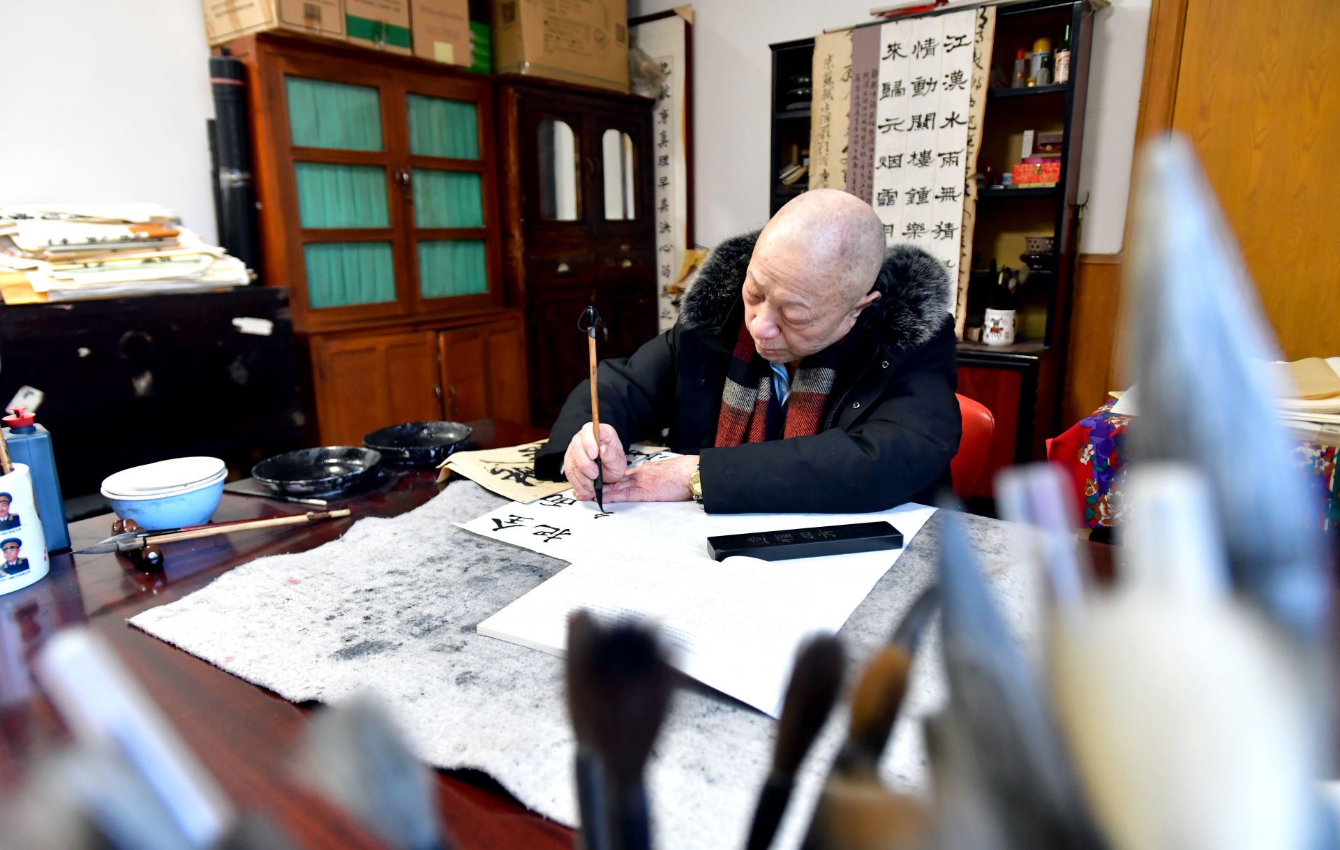 他愛書法,喜歡寫毛澤東詩詞,寫黨的重要理論、重要精神,并將這樣的紅色書法作品贈與青年黨員、年輕干部,督促勉勵他們加強學(xué)習(xí),時刻將黨和人民牢記心中。