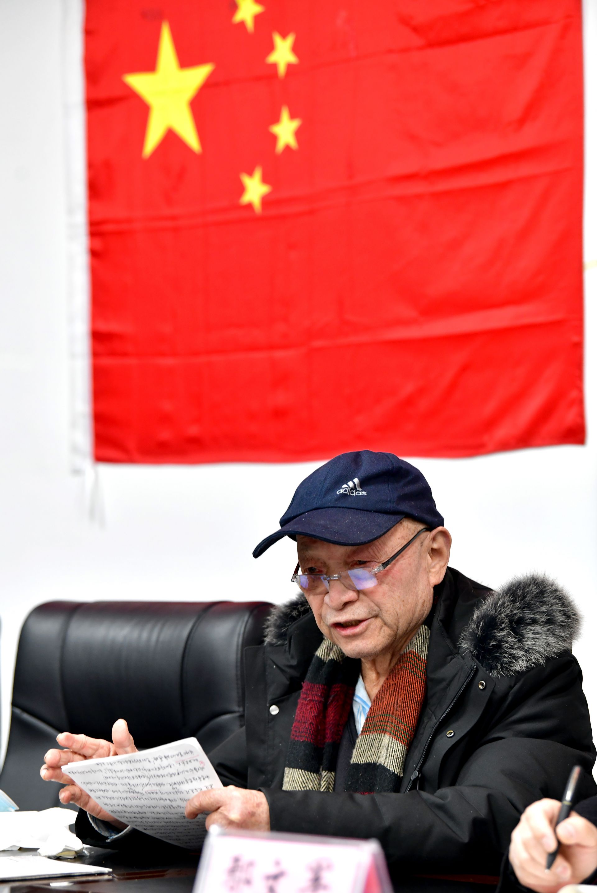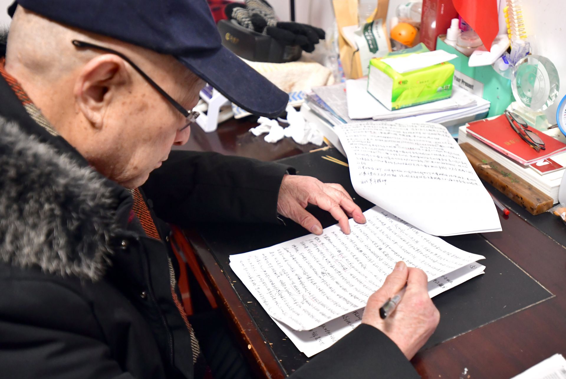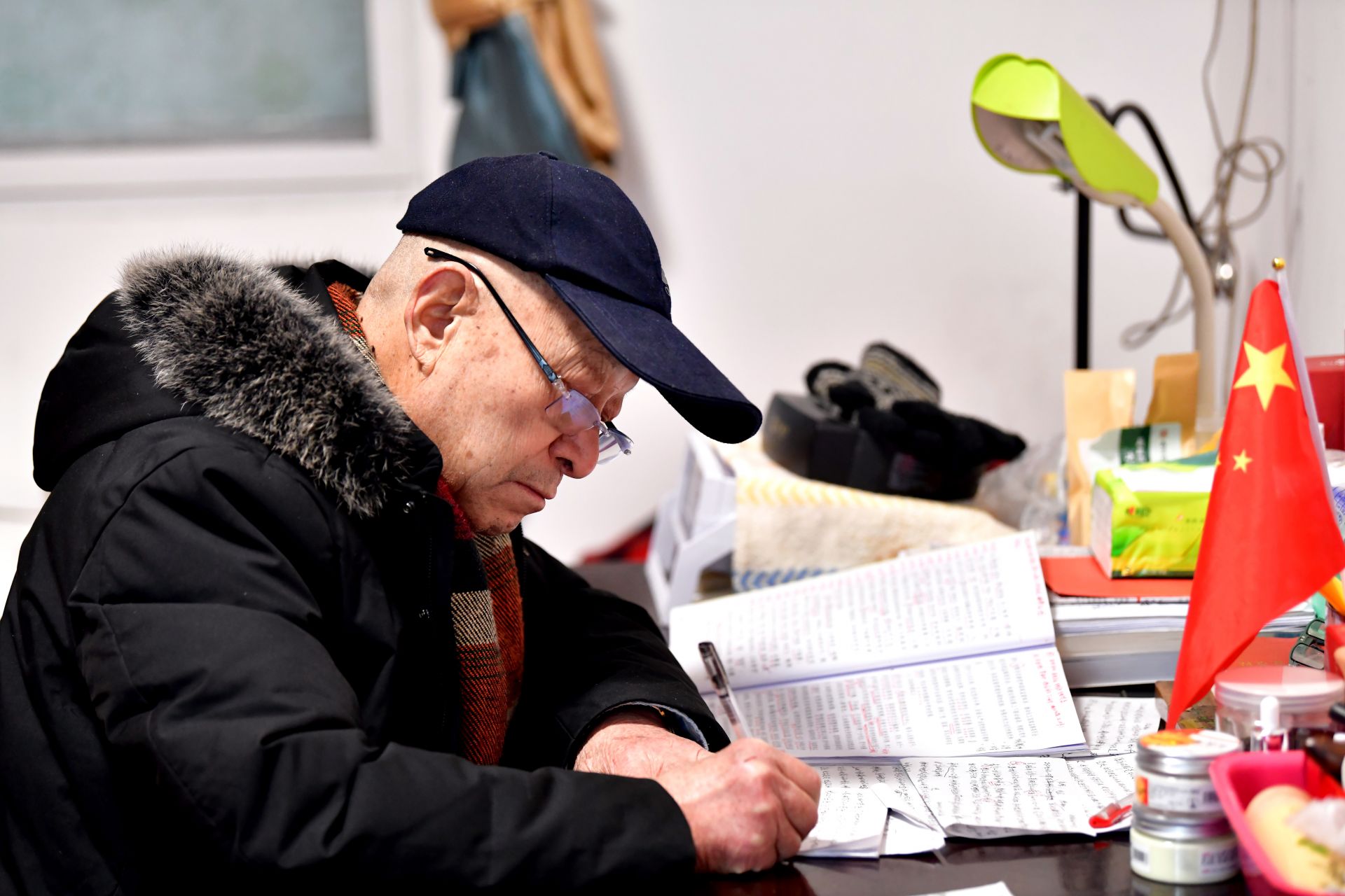 他的書桌上堆滿了厚厚的書籍,筆筒插著一面小國旗,面前攤開的報紙上,紅色的標(biāo)注分外醒目。老人正一筆一劃、不疾不徐地做著筆記。