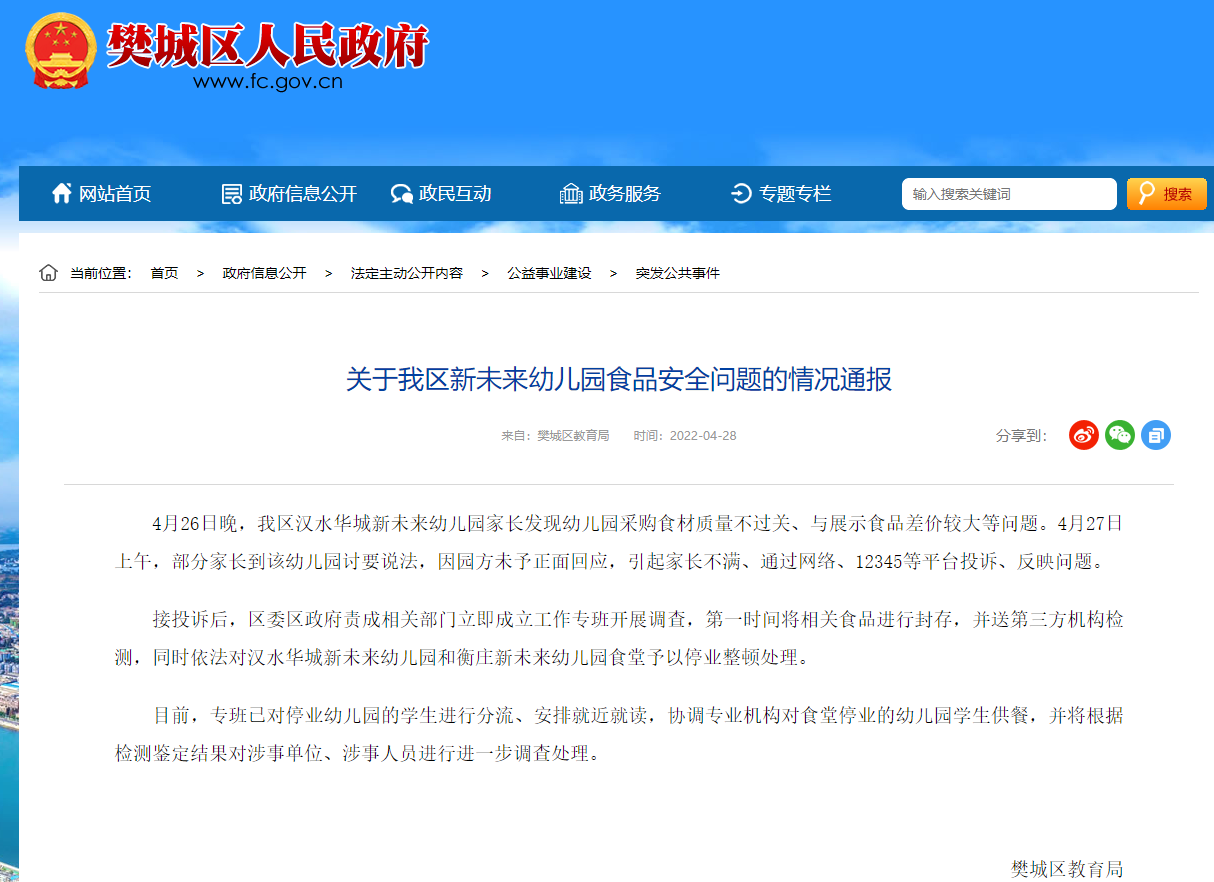 接投訴后,區(qū)委區(qū)政府責成相關部門立即成立工作專班開展調查,第一時間將相關食品進行封存,并送第三方機構檢測,同時依法對漢水華城新未來幼兒園和衡莊新未來幼兒園食堂予以停業(yè)整頓處理。