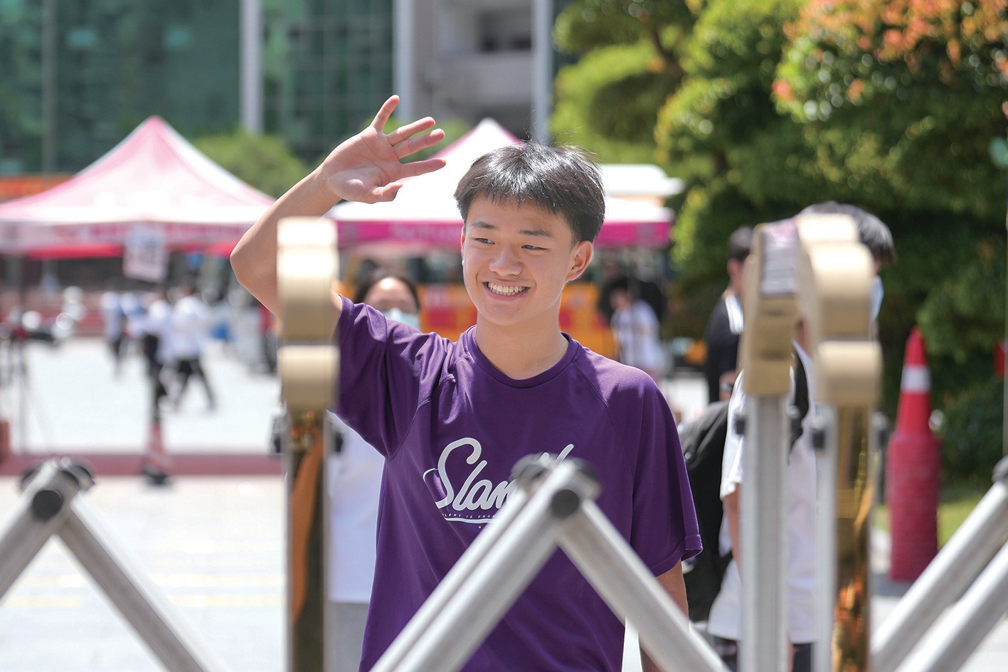 考點(diǎn)里,學(xué)生們有序排隊(duì)、測(cè)溫、驗(yàn)證,依次進(jìn)入考場(chǎng);考點(diǎn)外,一條警戒線將老師、家長(zhǎng)們隔離在外。盡管天氣炎熱,老師和家長(zhǎng)們還是守在校門口,滿懷希望的目光始終跟隨著孩子。