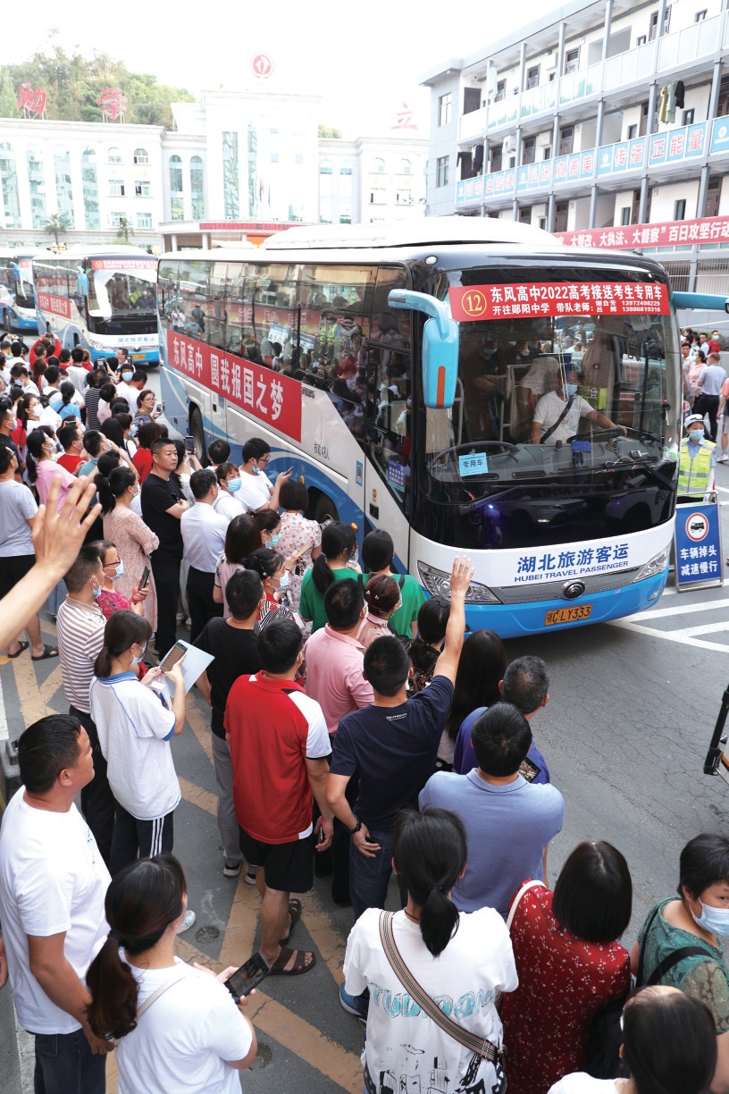 東風(fēng)高中的“少年戰(zhàn)士”踏上高考的征程。車身上的標(biāo)語(yǔ)“圓我報(bào)國(guó)之夢(mèng)”為孩子們的夢(mèng)想做了最好注解。