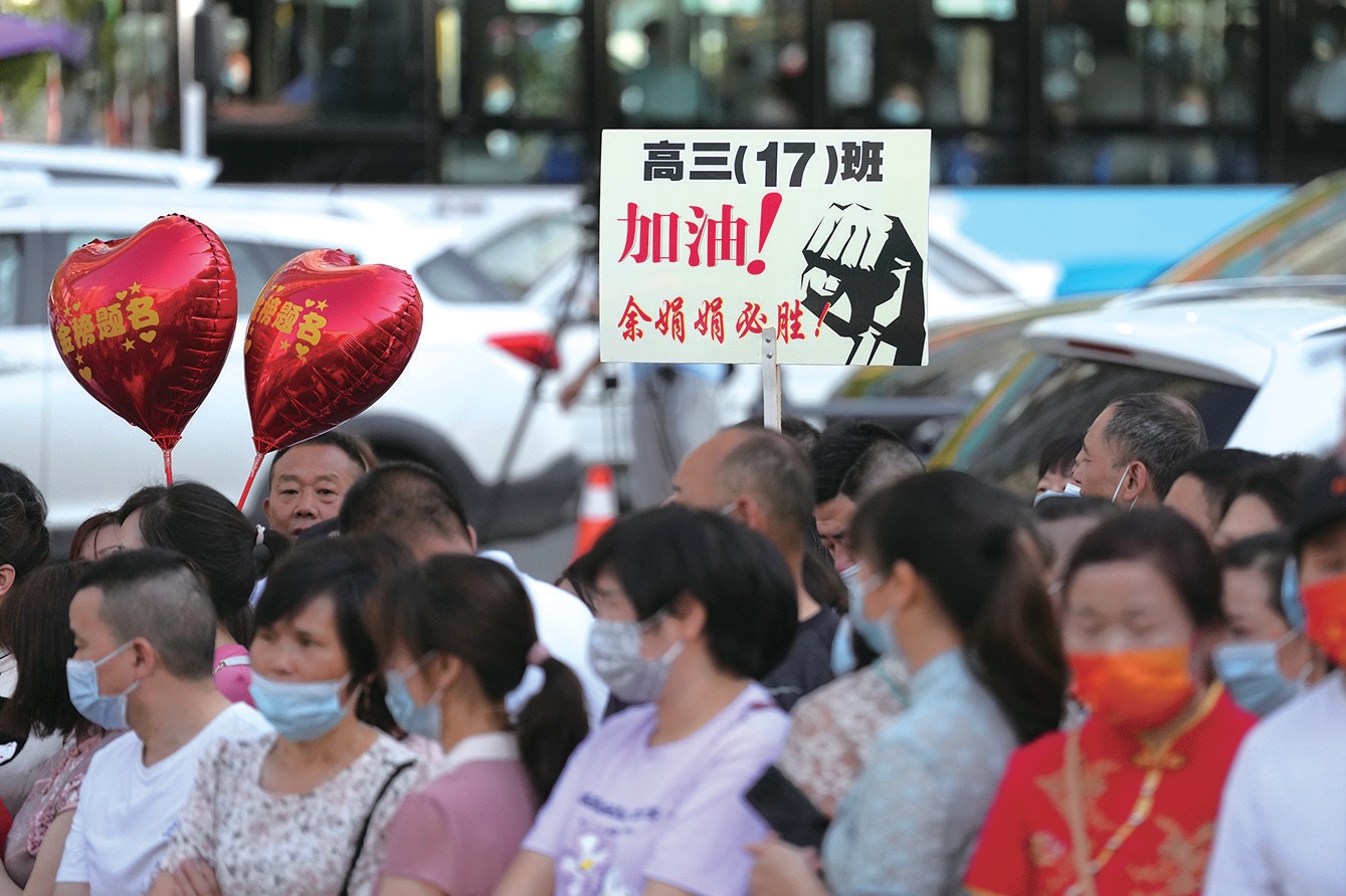 “金榜題名”的紅氣球、“必勝”的標(biāo)語(yǔ)牌、寓意“旗開得勝”的旗袍,送考的家長(zhǎng)們把濃濃的愛、殷切的期望化做各種加油鼓勁。高考,不僅是考生一個(gè)人的事,更是全家人共同的目標(biāo)。