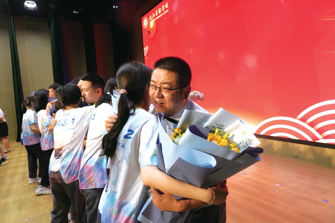 6月17日,漢江實(shí)驗(yàn)學(xué)校舉行“傳承榮光·感恩母?!?022屆九年級(jí)畢業(yè)典禮,為即將參加中考的學(xué)子們加油鼓勁。圖為學(xué)生與老師擁抱,表達(dá)感激之情。圖/通訊員 涂銀玥 鮑玉