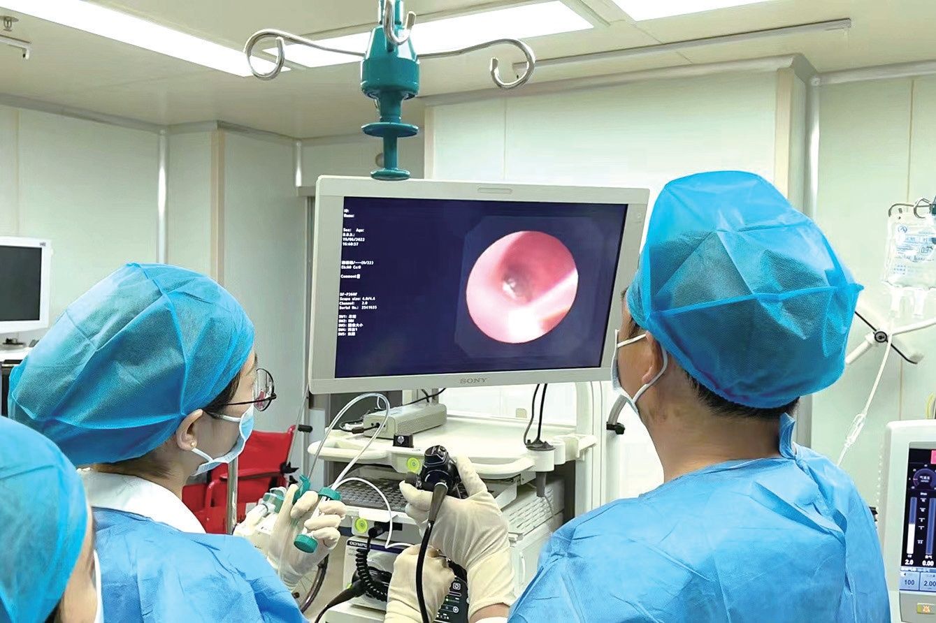 為患兒進行支氣管軟鏡取物手術(shù)。