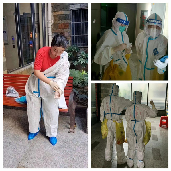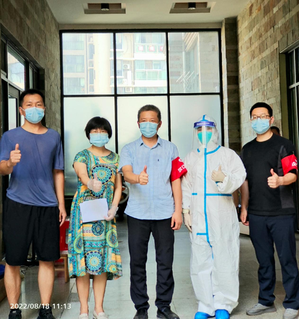 原來,自8月11日0時(shí)起,陽光棲谷小區(qū)實(shí)行嚴(yán)格的封控管理,需要進(jìn)行多輪全員核酸檢測(cè)。為提高核酸檢測(cè)采樣效率,需要在每個(gè)樓棟內(nèi)招募志愿者協(xié)助醫(yī)護(hù)人員作業(yè)?!拔沂轻t(yī)務(wù)工作者我可以!”得知消息后,住在6號(hào)樓的九三學(xué)社社員、太和醫(yī)院康復(fù)前移科醫(yī)生李中英主動(dòng)請(qǐng)纓,毫不猶豫地就地上崗。連日來,每次核酸檢測(cè)采樣完畢,脫掉防護(hù)服,李中英都是滿臉通紅、汗流浹背,雙手被橡膠手套里的汗水泡得發(fā)皺發(fā)白?!拔沂且幻t(yī)務(wù)工作者,這是我應(yīng)盡的職責(zé),疫情面前,自己是業(yè)主,也是志愿者,要帶頭沖鋒在一線”。李中英說。