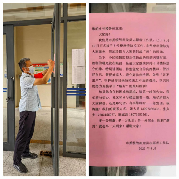 “守好門”是統(tǒng)戰(zhàn)突擊隊(duì)的首要任務(wù)?!拔蚁壬ヌ歪t(yī)院做透析,手機(jī)里只有社區(qū)發(fā)過來的通行證照片,我們可以出去嗎?”8月17日7點(diǎn)10分,市委統(tǒng)戰(zhàn)部駐守的6號(hào)樓業(yè)主王女士向突擊隊(duì)員張久安電話求助。在查驗(yàn)身份證、健康碼、核酸檢測(cè)結(jié)果并向社區(qū)核實(shí)后,張久安才準(zhǔn)予放行。