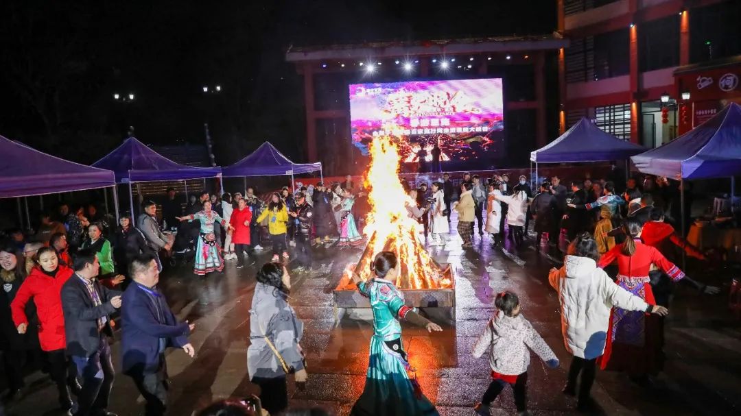 全國(guó)千企萬團(tuán)百家旅行商一行抵達(dá)恩施大峽谷景區(qū),入住女兒寨度假酒店。初春的夜晚,恩施大峽谷靜謐的山野顯得更加空靈,晚宴過后,大家齊聚女兒寨風(fēng)情廣場(chǎng)點(diǎn)燃熊熊的篝火,山歌嘹亮,舞蹈熱情,旅行商們與土家兒女齊跳擺手舞,篝火晚會(huì)現(xiàn)場(chǎng)歡聲一片。