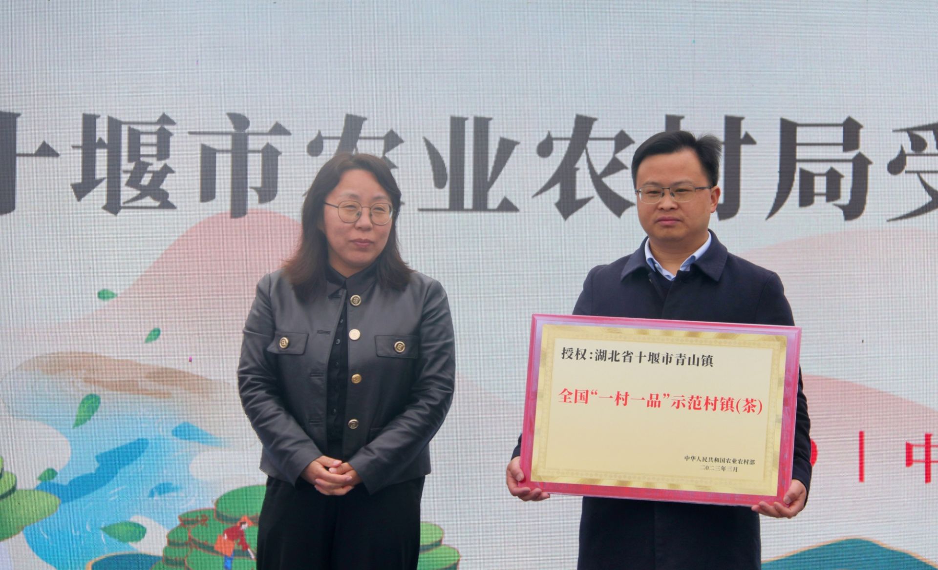 活動現(xiàn)場為青山鎮(zhèn)頒發(fā)全國“一村一品”示范村鎮(zhèn)獎牌(央廣網(wǎng)發(fā) 李磊 攝)