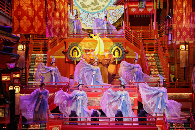 “長安十二時(shí)辰”主題街區(qū)內(nèi)的霓裳羽衣舞表演。